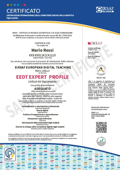 La seguente immagine un esempio del certificato ufficiale EEDT EXPERT PROFILE, rilasciato a seguito del superamento dell'esame di certificazione.