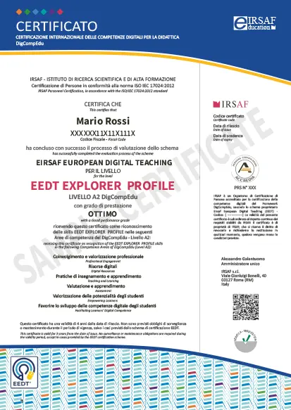 La seguente immagine è un esempio del certificato ufficiale EEDT EXPLORER PROFILE, rilasciato a seguito del superamento dell'esame di certificazione.